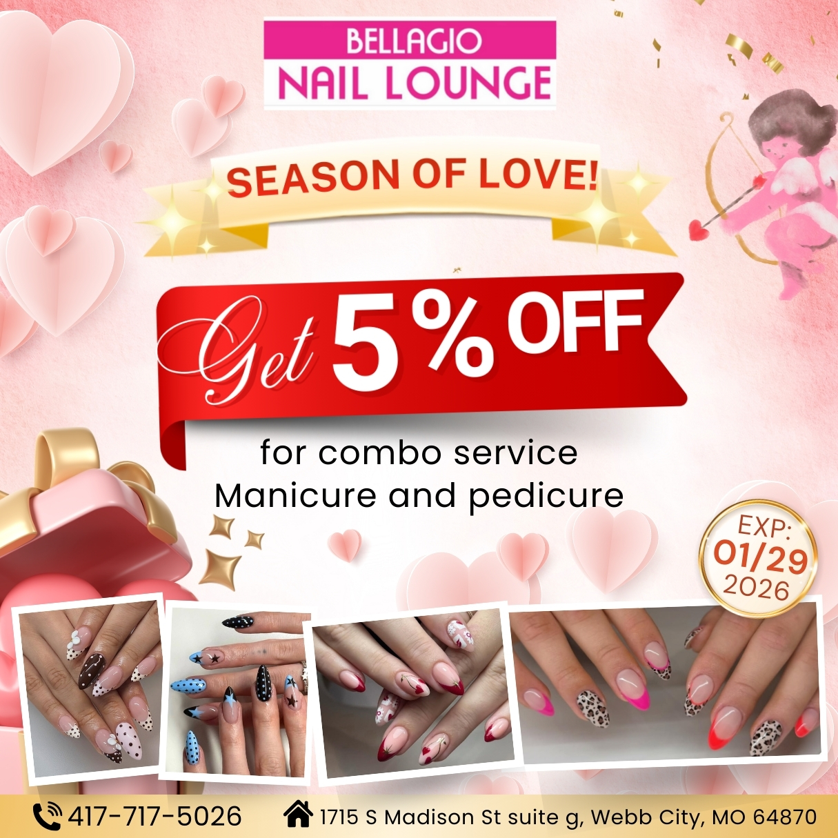 Located conveniently in Webb City, MO 64870, Our nail salon is one of the best salons in this area. Bellagio Nail Lounge offers premier nails care and spa treatment services to satisfy your needs of enhancing natural beauty and refreshing your day.